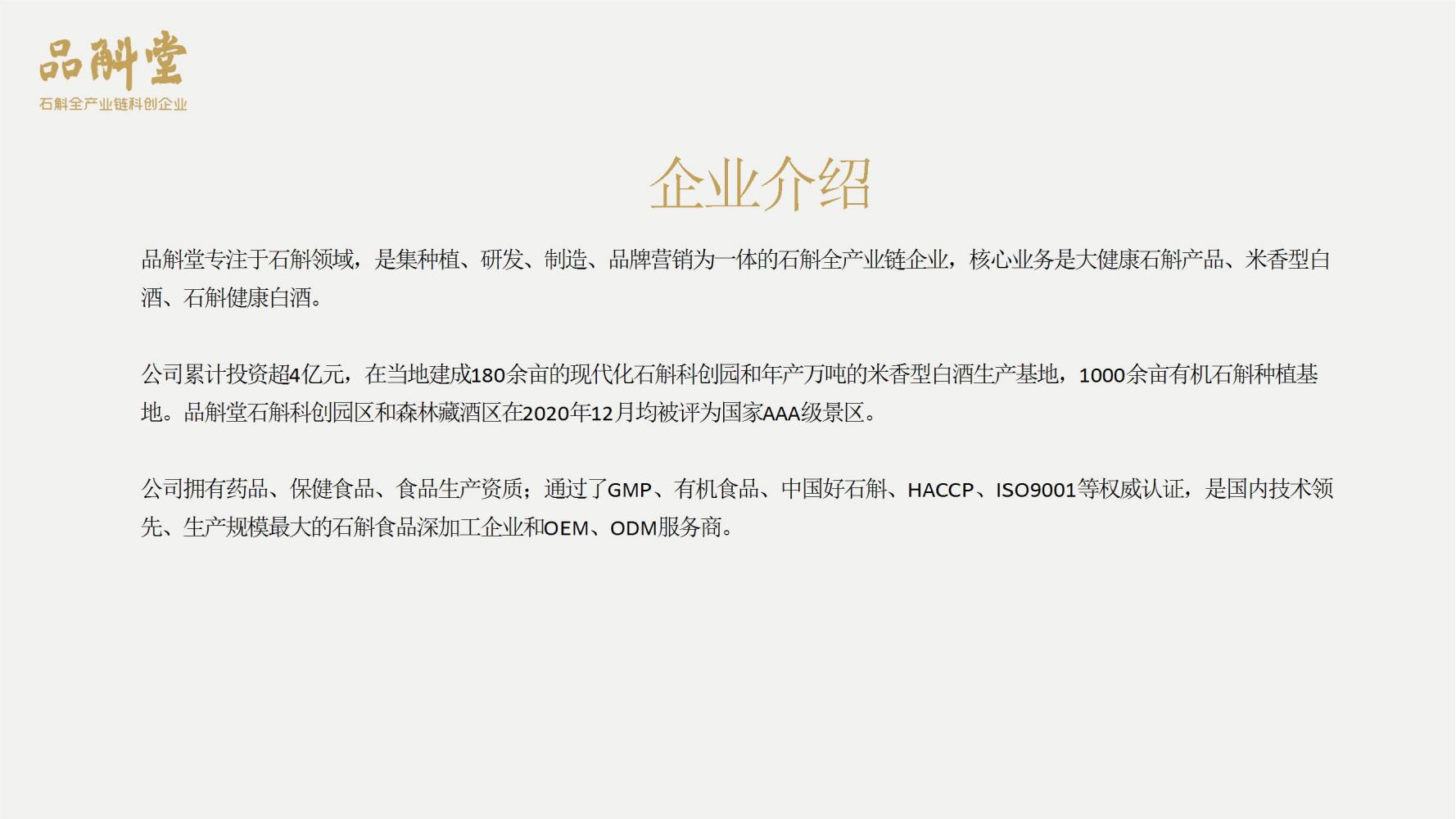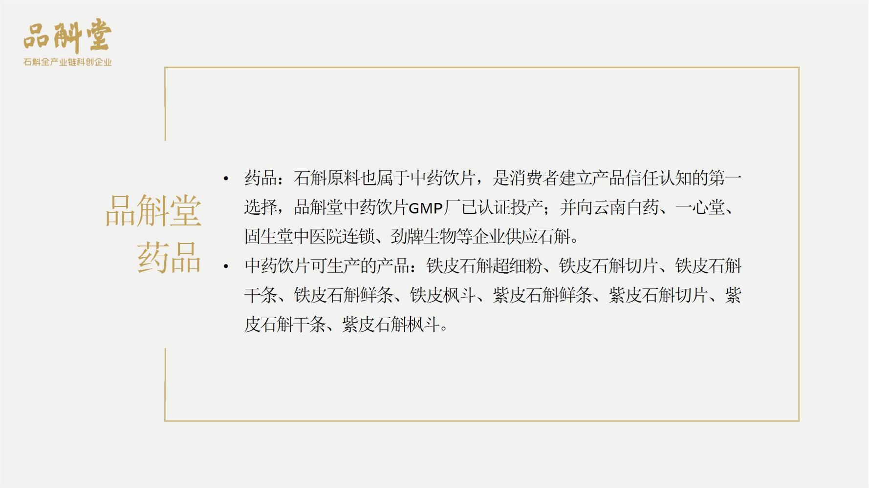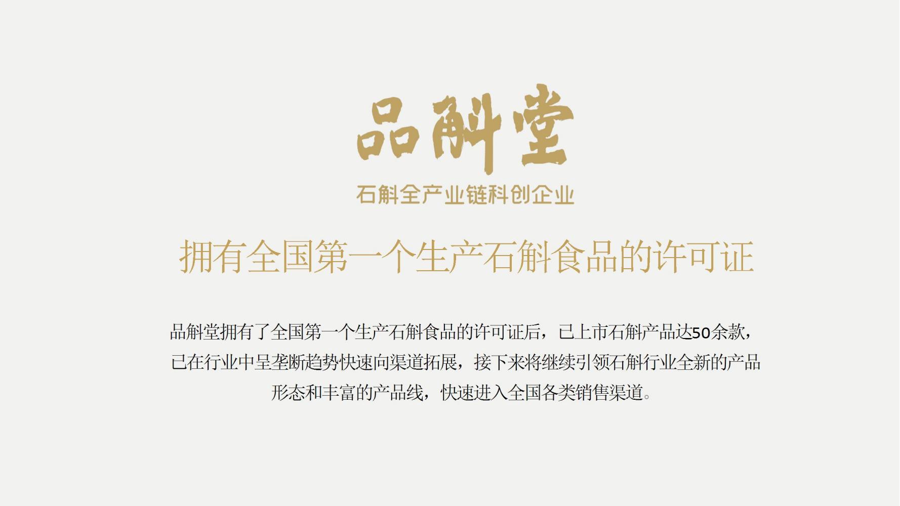 品斛堂专注于石斛领域,是集种植、研发、制造、品牌营销为一体的石斛全产业链企业,核心业务是大健康石斛产品、米香型白酒、石斛健康白酒。