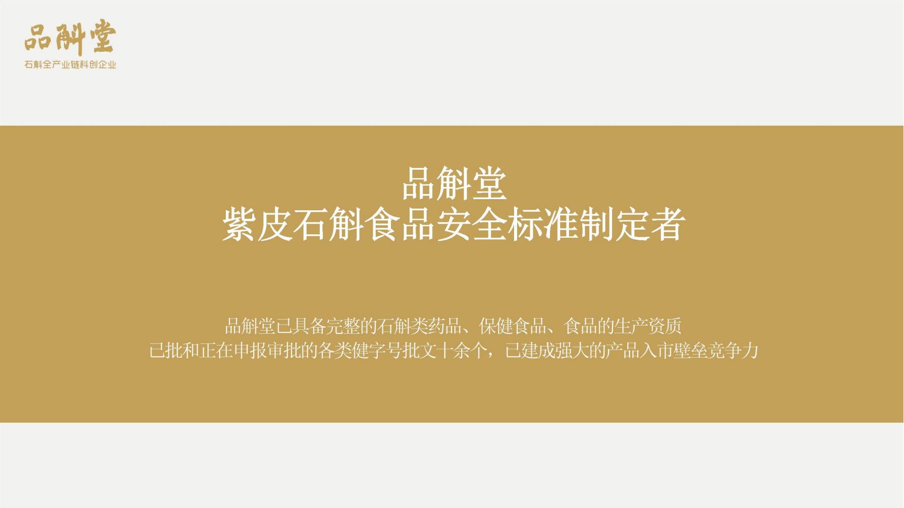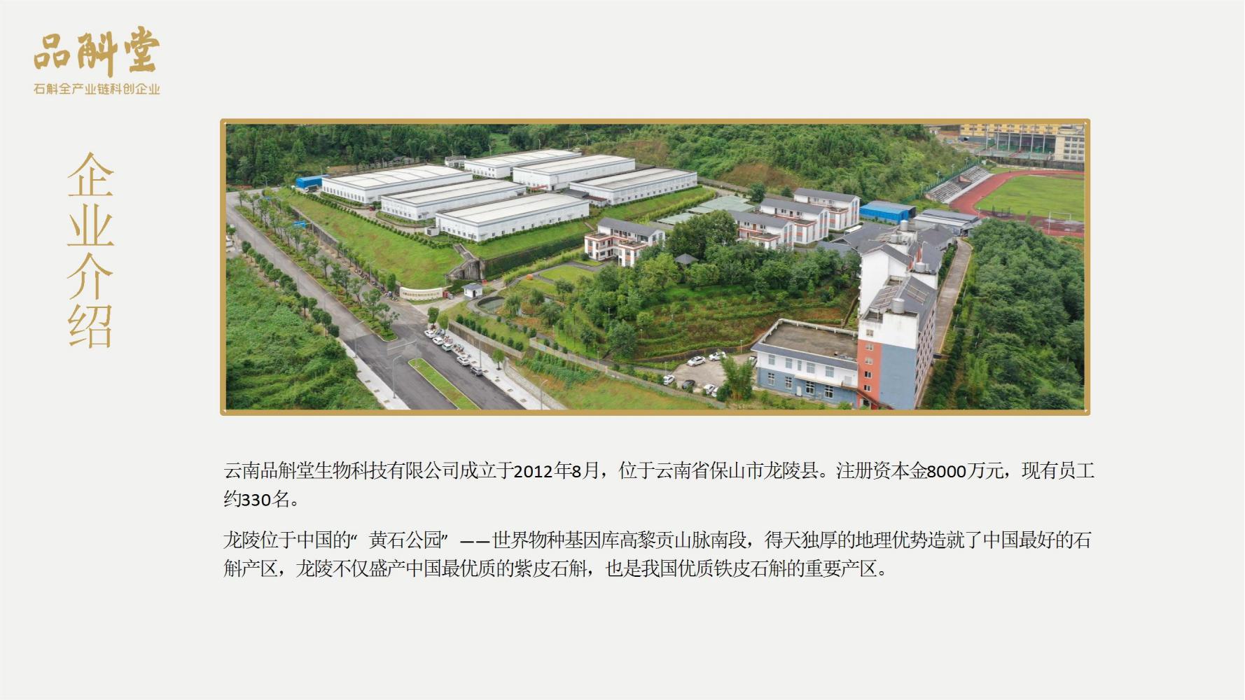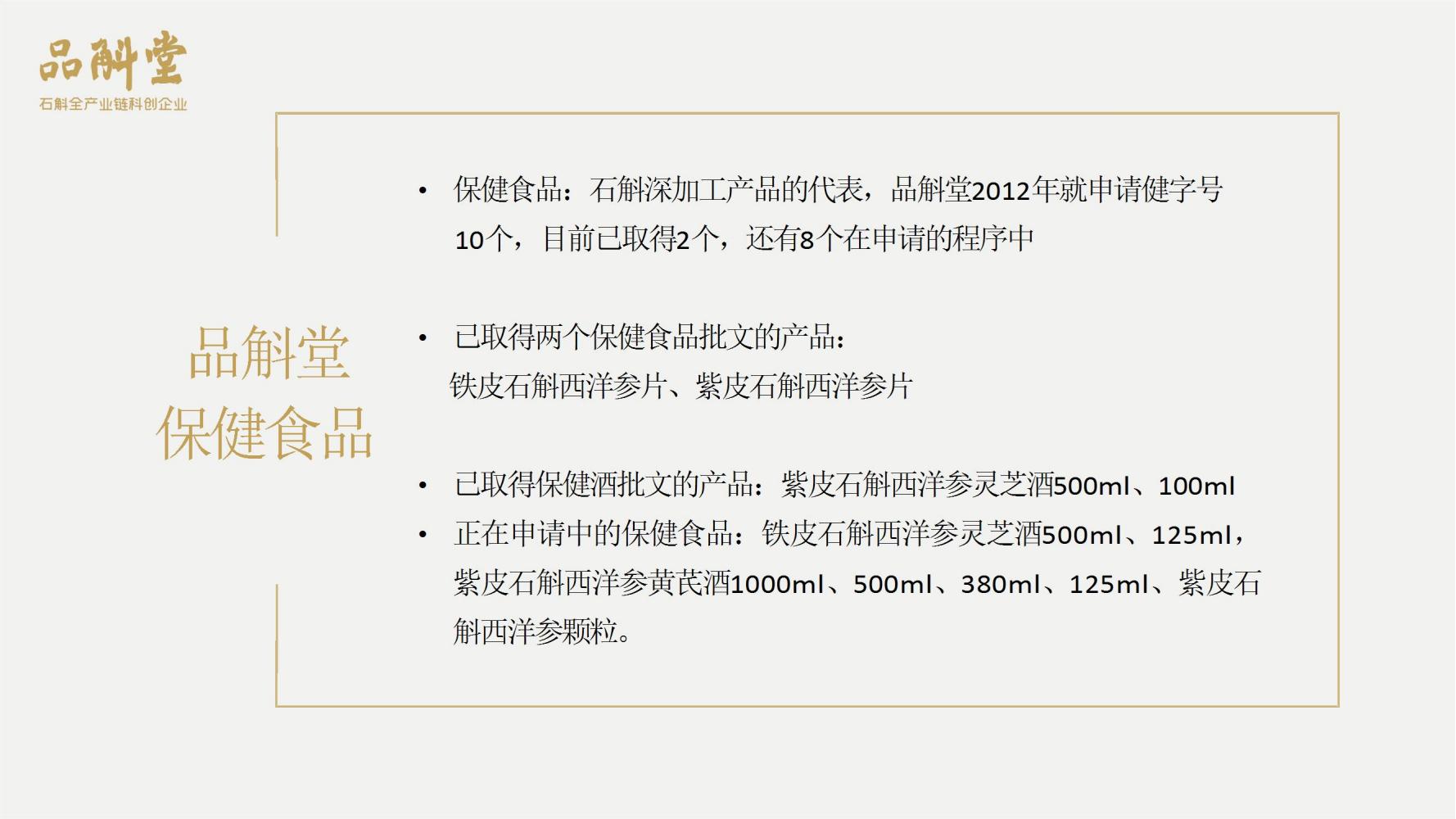品斛堂专注于石斛领域,是集种植、研发、制造、品牌营销为一体的石斛全产业链企业,核心业务是大健康石斛产品、米香型白酒、石斛健康白酒。